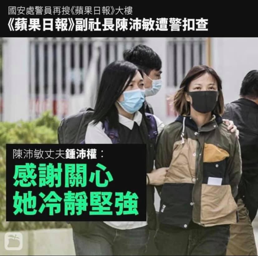 W1hmp K8u5kkwm from media.mingjingnews.com Jun 18, 2021 · 她的丈夫鍾沛權,同時也是網媒「立場新聞」總編輯,昨日在facebook發文交代妻子情況。他形容陳沛敏「冷靜、堅強和鎮定」,並指已有律師協助陳沛敏,感謝大家的關心和問候。 陳沛敏1996年入職《蘋果》,做記者20多年,採訪經驗豐富。她在前線專責保安新聞. Jun 17, 2021 · 陳沛敏的丈夫、網媒《立場新聞》總編輯鍾沛權透過社交平台交代妻子情況。他表示,陳沛敏已有律師協助,指她「冷靜、堅強和鎮定」,並感謝大家的關心和問候。 Jun 18, 2021 · 《蘋果日報》副社長陳沛敏涉串謀勾結外國或境外勢力危害國家安全罪。 (星島日報報道)警方搜查《蘋果日報》副社長陳沛敏住所時,疑有人拒絕開門,唯有強行破門入屋,拘捕陳沛敏及帶走三部疑屬其丈夫、網媒《立場新聞》總編輯鍾沛權的電腦,當中兩部是手提電腦,及一部平板電腦,暫. Jun 17, 2021 · 【10:34】陳沛敏被押返《蘋果日報》大樓調查。 【10:10】張劍虹被押返《蘋果日報》大樓,其代表律師已到場協助。 【09:56】陳沛敏丈夫、立場新聞總編輯鍾沛權於個人facebook表示,陳沛敏目前已獲律師協助,形容她冷靜、堅強和鎮定。 Jun 28, 2021 · 今次包括吴、练在内的六人辞去董事职务后,仅馀蔡东豪及锺沛权留任董事。 《立场》长期与《苹果日报》关系密切,总编辑锺沛权正是前《苹果日报》副社长陈沛敏的丈夫。 Jun 18, 2021 · 陳沛敏則於丈夫陪同下離開將軍澳警署,她步出警署時表示對於兩同事張劍虹及羅偉光被起訴而未能獲保釋感到難過,希望他們盡早獲保釋。 陳沛敏又指得知於被扣押期間,《蘋果日報》同事以專業緊守崗位繼續採訪及報導,對此感到自豪及感動「盡量做啦我哋